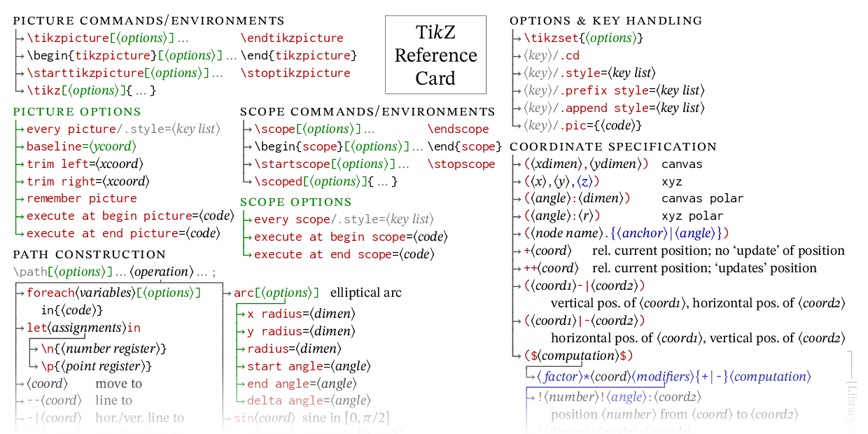 This is a reference card for the TikZ graphics language. I created it over ten years ago for my own use as a quick reference for the available options and their precise syntax. On seeing the name of an option, I can remember what it does, so the amount of explanation ranges from little to none. My intention was mainly to fit as much information as possible about TikZ syntax into two sides of paper.