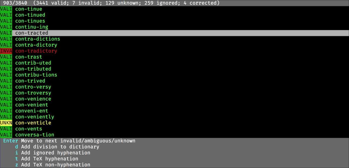 It takes a list of hyphenations from the document (produced, for example, using the lua-list-hyphen package) and a dictionary of valid divisions, a list of TeX hyphenation exceptions, (optionally) a list of ignored hyphenations, and presents the user with the list of hyphenations, categorizing them as valid or invalid according to the dictionary, and allowing quick editing (using Emacs-style keybindings) of the dictionary or additions to the list of TeX hyphenations or list of ignored hyphenations.